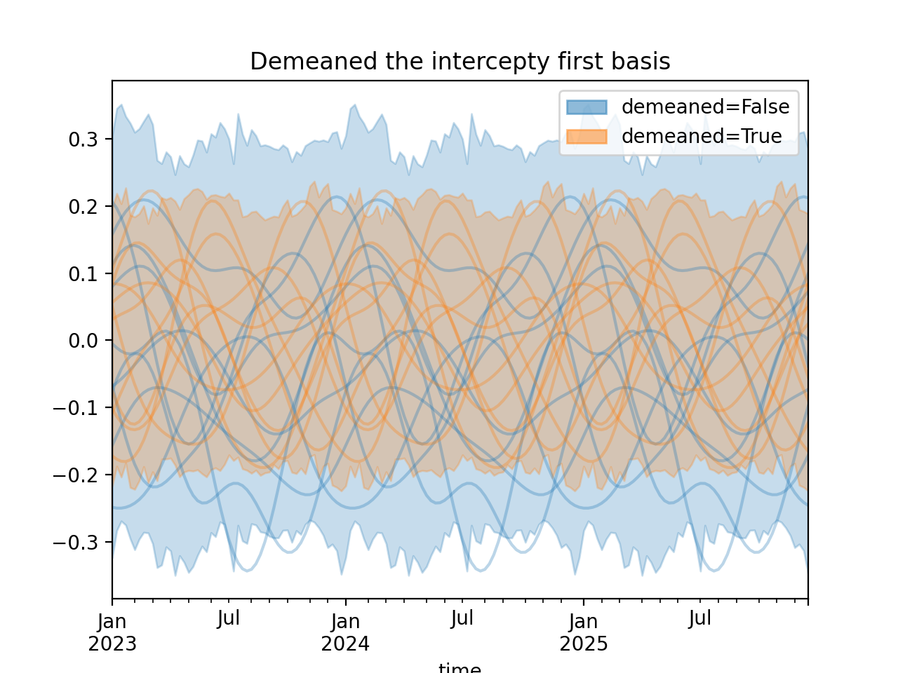 import numpy as np import pandas as pd import xarray as xr import matplotlib.pyplot as plt from pymc_marketing.mmm import HSGPPeriodic from pymc_marketing.plot import plot_curve seed = sum(map(ord, "Periodic GP")) rng = np.random.default_rng(seed) scale = 0.25 ls = 1 kwargs = dict(ls=ls, scale=scale, period=52, cov_func="periodic", dims="time", m=20) n = 52 * 3 dates = pd.date_range("2023-01-01", periods=n, freq="W-MON") X = np.arange(n) coords = {"time": dates} hsgp = HSGPPeriodic(demeaned_basis=False, **kwargs).register_data(X) hsgp_demeaned = HSGPPeriodic(demeaned_basis=True, **kwargs).register_data(X) def sample_curve(hsgp): return hsgp.sample_prior(coords=coords, random_seed=rng)["f"] non_demeaned = sample_curve(hsgp).rename("False") demeaned = sample_curve(hsgp_demeaned).rename("True") combined = xr.merge([non_demeaned, demeaned]).to_array("demeaned") _, axes = combined.pipe(plot_curve, "time", same_axes=True) axes[0].set(title="Demeaned the intercepty first basis") plt.show()